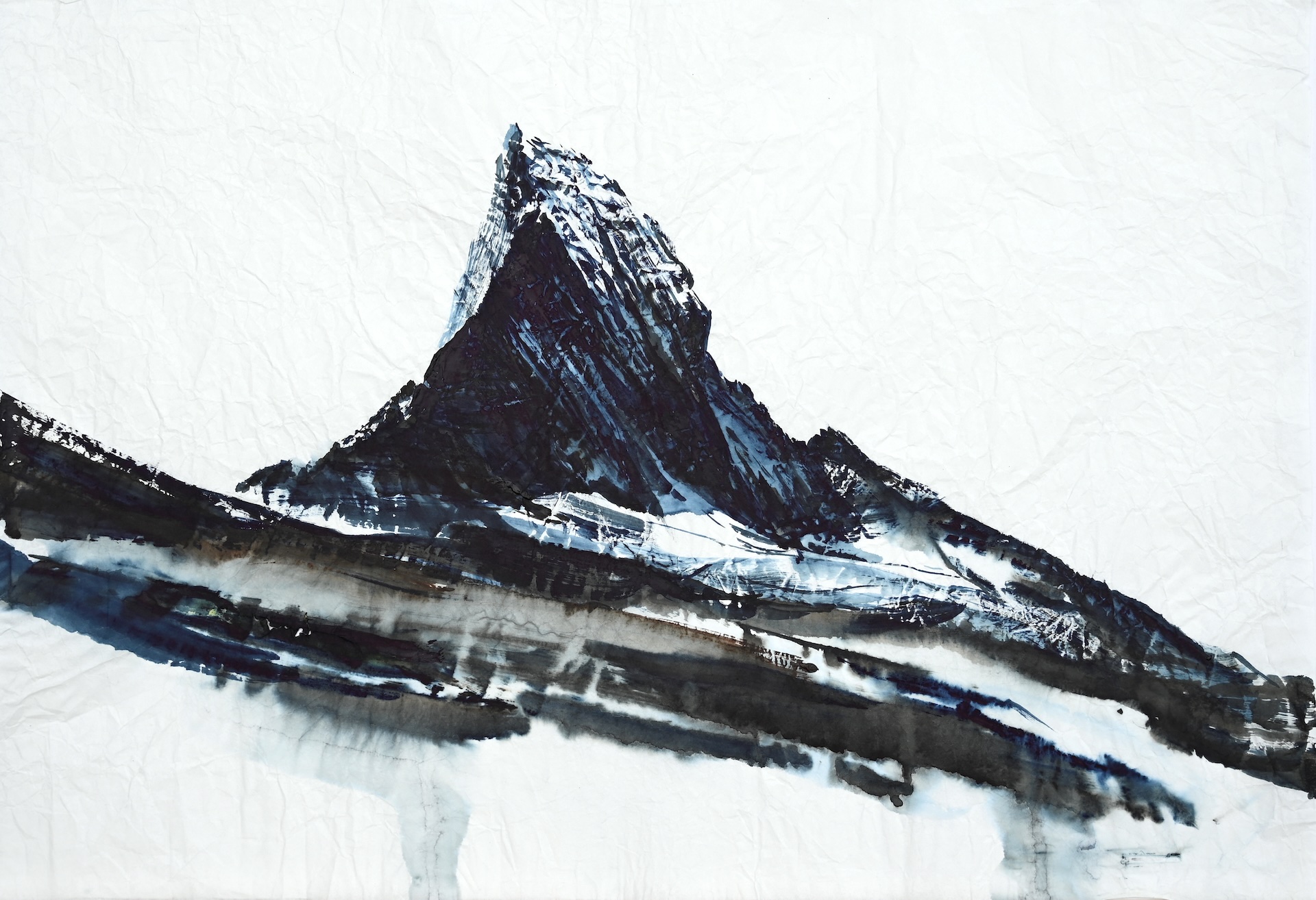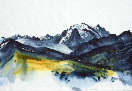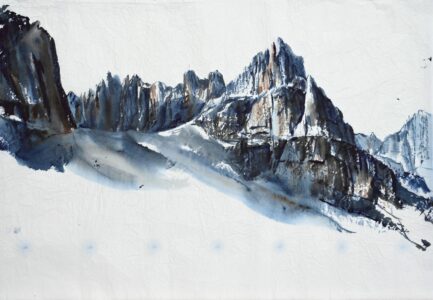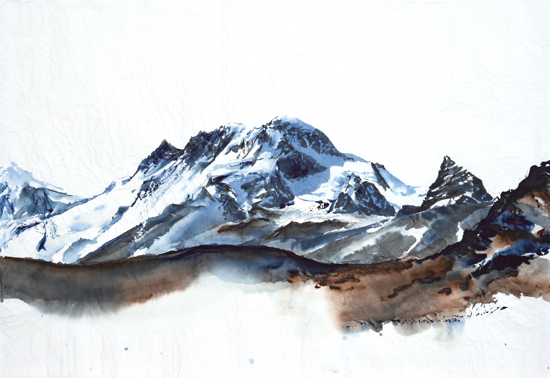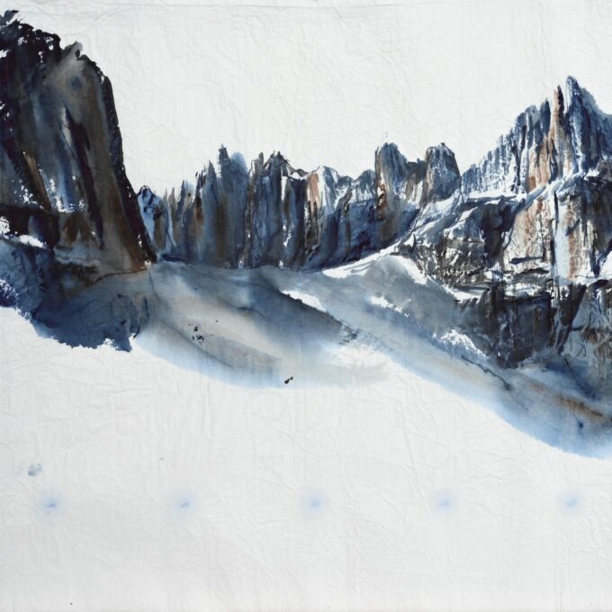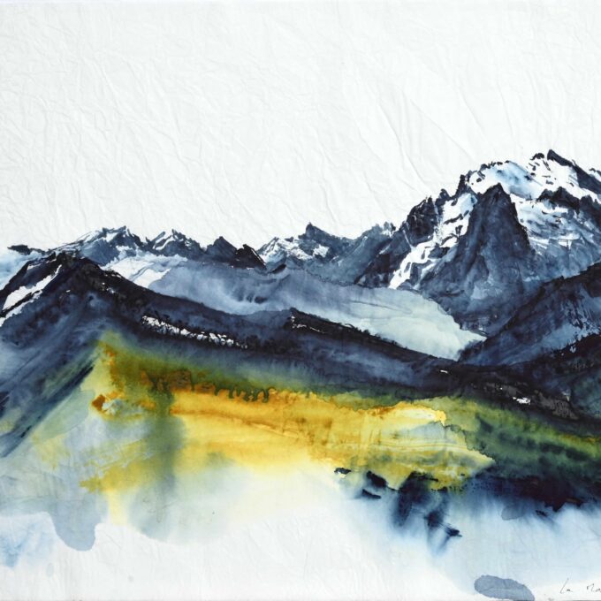 Des aquarelles peintes sur papier froissé lors d’une traversée de l’arc alpin à pied, de la Méditerranée à l’Adriatique, pour rendre compte d’une expérience conjointe de la marche et de la peinture.